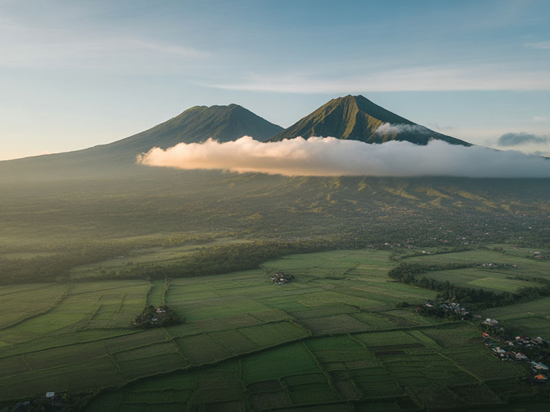بالی در مختصات دقیق ۸°۲۵′ جنوبی و ۱۱۵°۱۰′ شرقی قرار دارد؛ نقطه ای استراتژیک در کمربند آتش اقیانوس آرام که صفحات تکتونیکی هند-استرالیا و اوراسیا در آن با هم برخورد می کنند و منظره ای از آتشفشان های فعال، دره های عمیق و سواحل متنوع خلق کرده اند. این برخورد تکتونیکی نه تنها دلیل وجود آتشفشان هایی مانند آگونگ (۳۰۳۱ متر) و باتور (۱۷۱۷ متر) است، بلکه خاک حاصلخیز جزیره را با مواد معدنی غنی کرده که مزارع برنج را به رنگ زمردی درآورده. جزیره الماس شکل بالی با طول ۱۵۳ کیلومتر از شرق به غرب و عرض حداکثر ۱۱۲ کیلومتر از شمال به جنوب، مساحتی برابر ۵۷۸۰ کیلومتر مربع دارد؛ اندازه ای که اجازه می دهد در یک سفر ۱۰روزه، از قله آگونگ تا عمق خلیج آموک را فتح کنید بدون اینکه خسته شوید.
