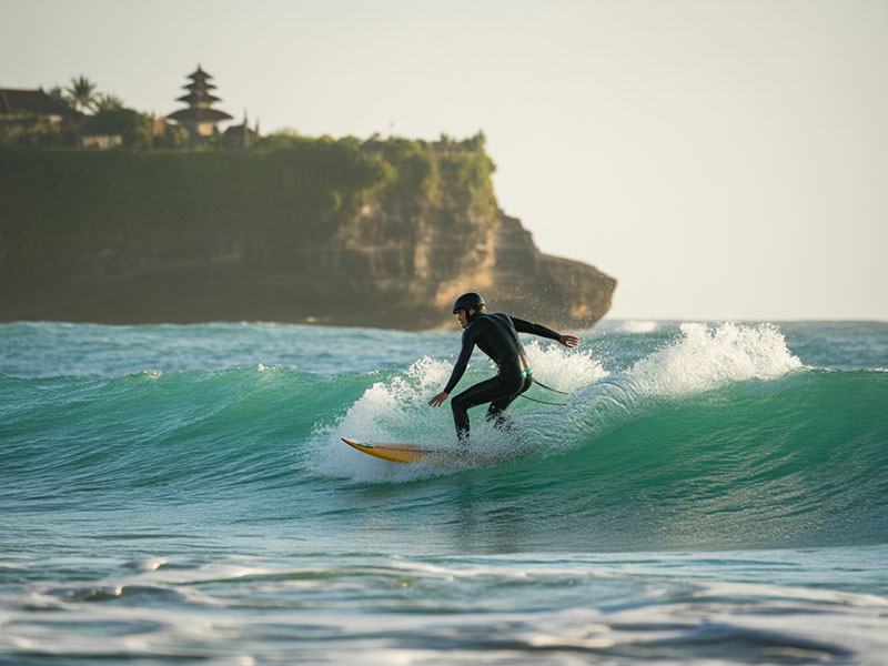 موج سواری: آوریل-اکتبر با سوئل جنوب غربی (امواج ۱-۳ متری). کوتا و سمین یاک برای مبتدیان (امواج ملایم، مدارس سرف با مربی ۵۰ دلار/ساعت)، اولوواتو، پادانگ پادانگ و ایمپوسیبل برای حرفه ای ها (تیوب های ۵ متری، صخره های تیز). غواصی و اسنورکلینگ: مه-اکتبر (شفافیت ۲۵-۴۰ متر، دمای آب ۲۷-۲۹ درجه). بهترین سایت ها برای مانتا: نوسا پنینسولا (سپتامبر-نوامبر). کایت سرفیینگ و بادسواری: ژوئن-سپتامبر در سانور و نوسا دوا (بادهای پایدار ۱۸-۳۰ گره، درس ۱۰۰ دلار). پاراسیلینگ و جت اسکی ، اما آرام ترین آب ها در فصل خشک.